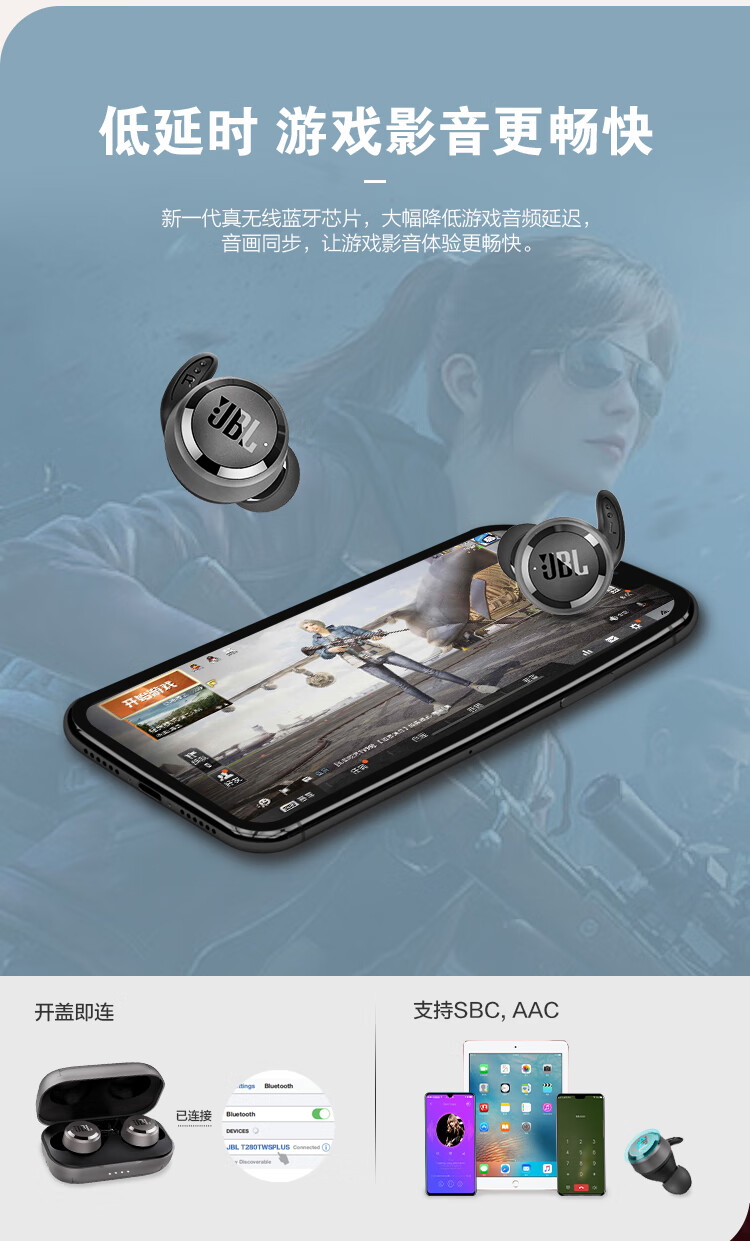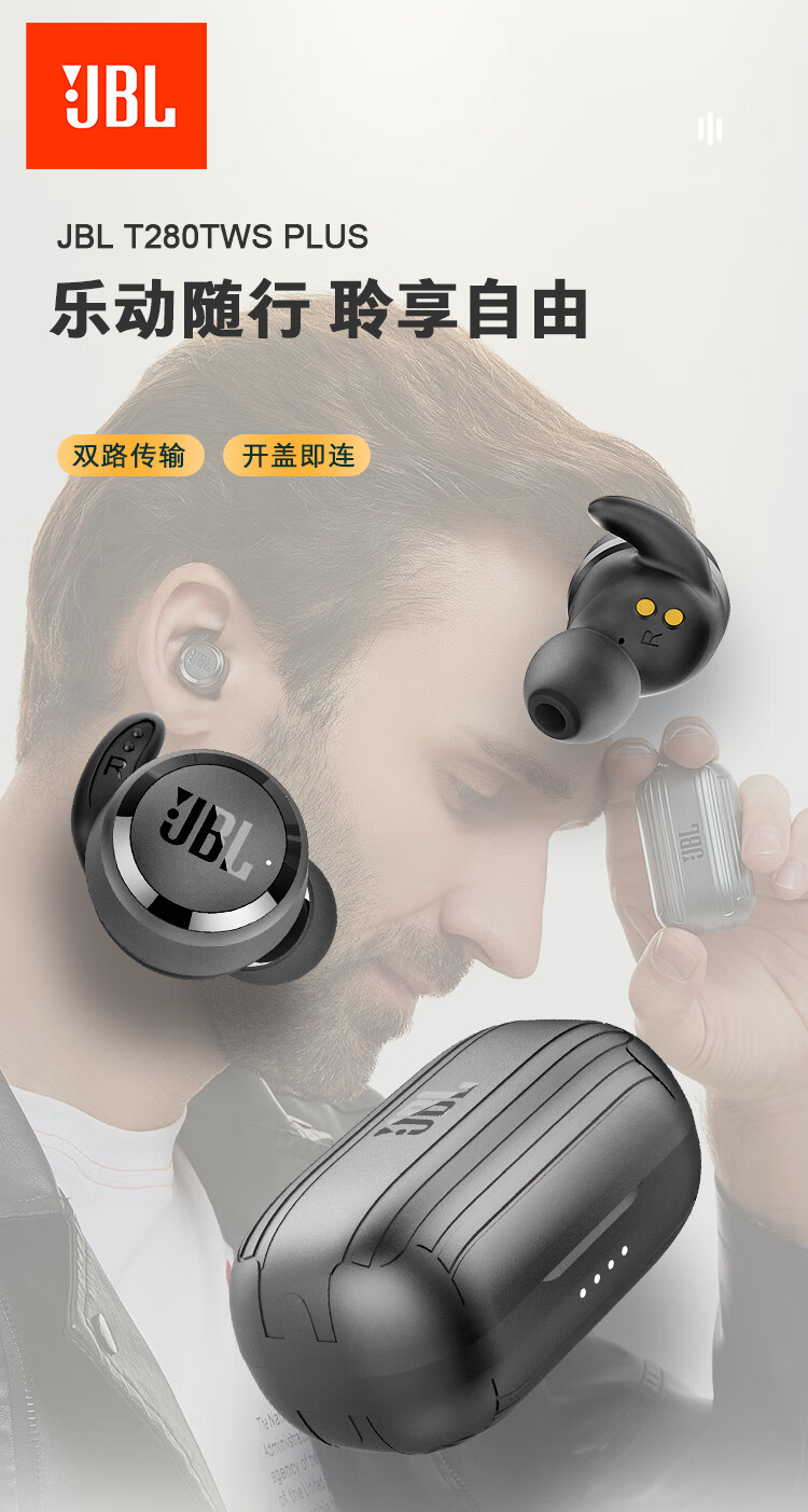 JBL(JBL) T280TWS PLUS 真无线蓝牙耳机 半入耳式运动耳机 手机音乐双耳立体声苹果安卓通用耳机 寒光灰